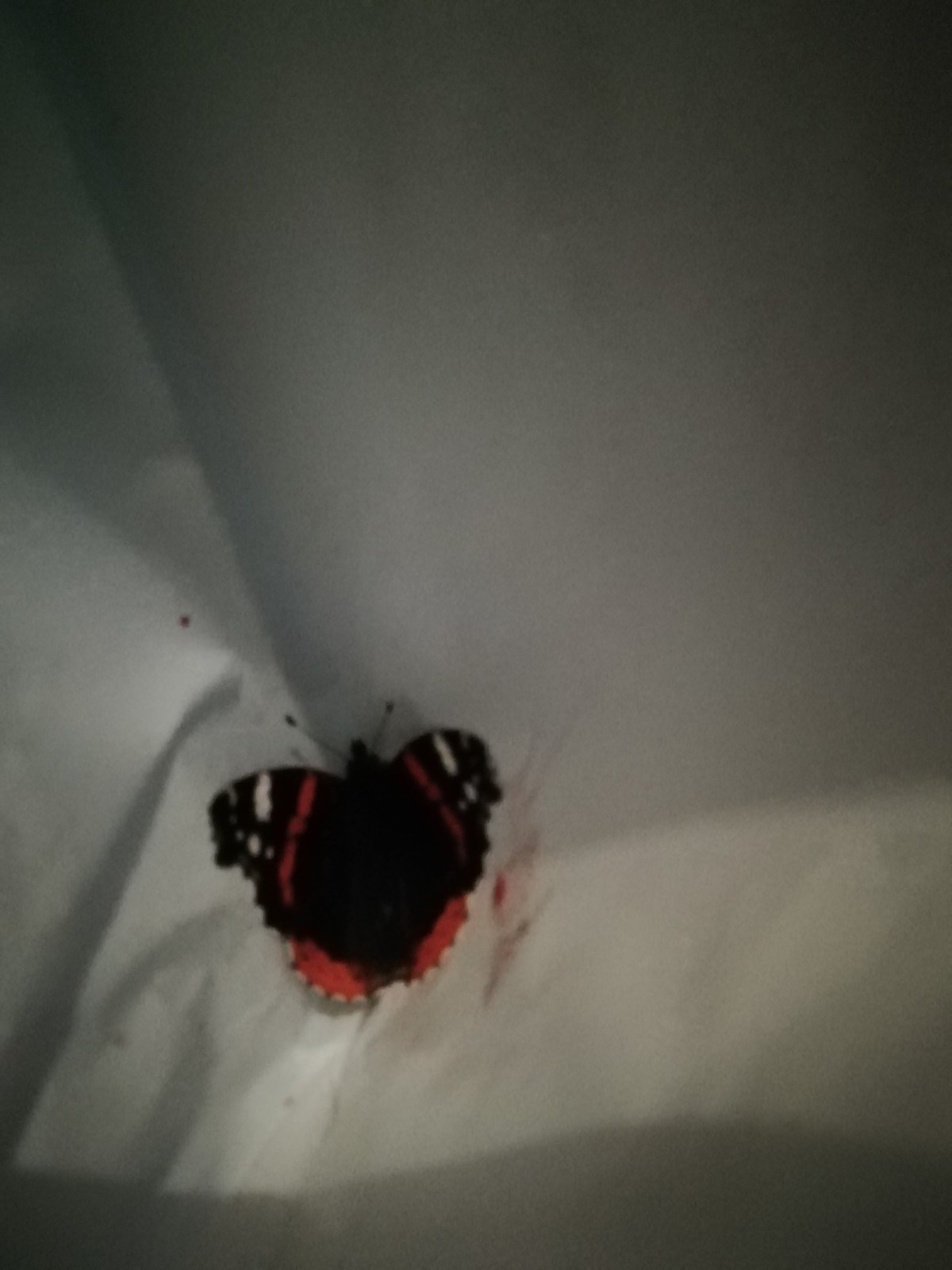 هذه الفراشة دخلت لغرفتي أمس، كانت تستطيع الطيران عندما دخلت، ولكنها اختبأت وسط بعض أغراض الغرفة، أخرجتها بورقة ووضعتها بين بعض نباتات الصبار في الشرفة، لكنها مازالت واقفة كما وضعتها بالأمس! لم تطر ولم تفعل أي شيء، إذ يبدو لي أنها غير قادرة على هذا!