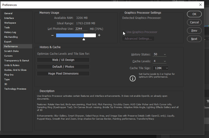 والدخول إلى Preformance وتفعيل الخيار "Use Graphics Processor" ولكنني لا أستطيع تفعيله لسبب ما (البعض يرجع إلى ان الخطأ بفعلِ عدم تحديث كرت الشاشة؛ لكن الحقيقة لا أعرف مصداقية هذا القول)