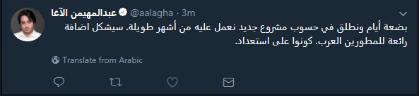 قبل دقائق أعلن الآغا في حسابه على تويتر أنهم سيطلقون مشروع جديد سيفيد المطورين العرب.