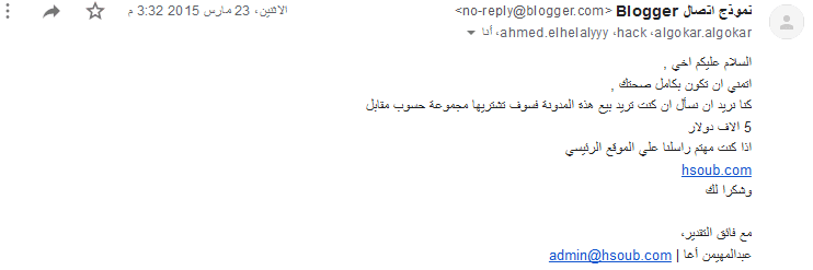 احيانا احب أُقلب برسائل البريد الالكتروني القديمة خاصتي ، فأنا غالبا لا احذف اي رسالة بريد الكتروني واحتفظ بها جميعها ومن النادر ان اقوم بحذف شئ منها ، لفت انتباهي قبل قليل رسالة قد وردتني بالسابق من احدهم ينتحل فيها شخصية السيد الموقر عبد المهمين الأغا ، يطلب مني الاستحواذ على المدونة :)