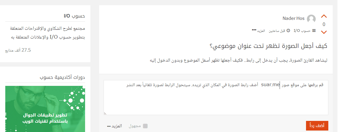 قم برفعها على موقع صور suar.me أضف رابط الصورة في المكان الذي تريده. سيتحول الرابط لصورة تلقائياً بعد النشر