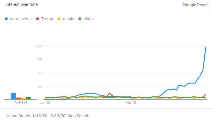 خدمة "جوجل تريند" توفر البيانات والاحصائيات التي تشغل محركات بحث الدول ومواطنيها هذه الفترة، فعلى مستوى الدول الأجنبية ونأخذ الولايات المتحدة الأمريكية كمثال، شهدت عمليات البحث أول ارتفاع كبير في نهاية شهر يناير بعد أن تم تشخيص أول إصابة بفيروس كورونا ما أدى إلى تخوف المواطنون من انتشاره واستخدموا اجهزتهم للبحث عنه، وهذا مخطط بياني يفهرس اهتمام المواطنين في ظل أزمة فيروس كورونا خلال الشهرين الماضيين مقارنة باهتمامهم بالموسيقى والفيديو.