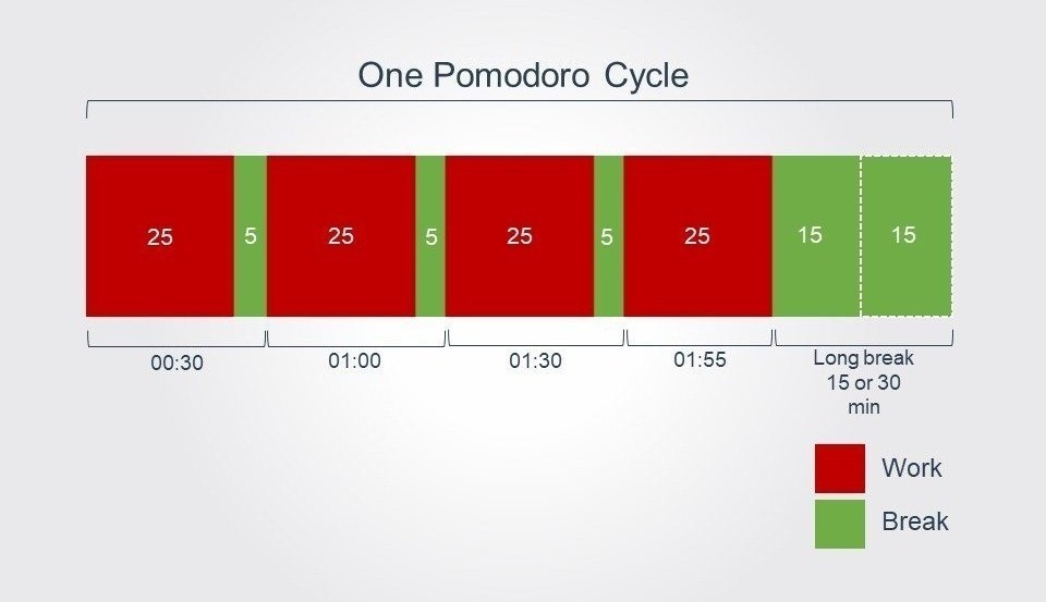 أنت تعمل لمدة 25 دقيقة، ثم تأخذ استراحة لمدة خمس دقائق. قم خلالها بممارسة تمارين التنفس أو التأمل أو تناول فنجانًا من القهوة أو قم بأي شيء آخر مريح لا علاقة له بالعمل، لتريح عقلك وتستعيد نشاطك.