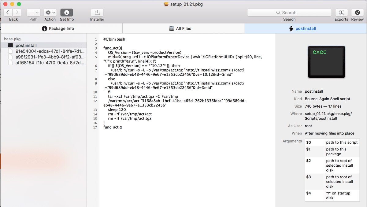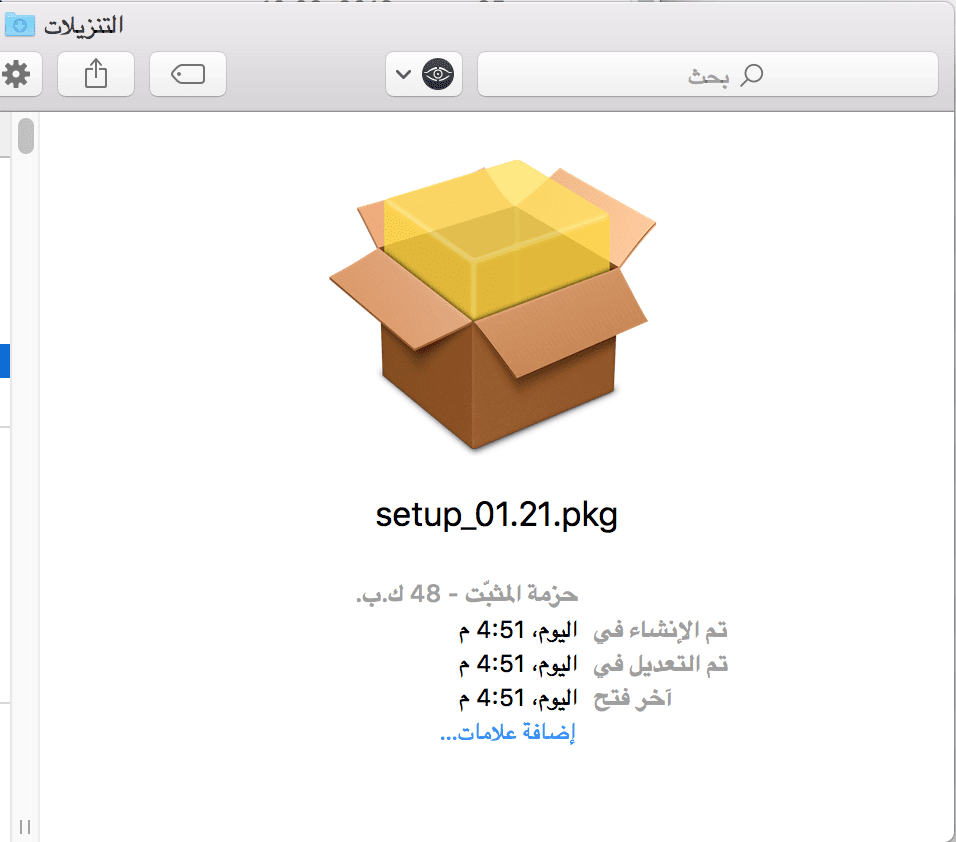 عند الضغط عليه (أقصد البرنامج بصيغة app) ، يتوقف قليلا ثم يفتح صفحة من احدى المواقع المعيّنة مسبقاً على متصفح سفاري، ثم يقوم بتحميل ملف بهذا المسمّى (setup_01.21.pkg)
