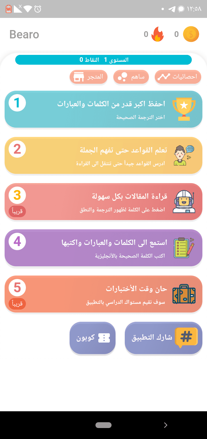 التطبيق يجعلك تقوم بأختيار الترجمة الصحيحه مره باللغة العربيه ومره بالانجليزيه ويوجد قواعد اللغة والكتابة وايضا نطق صوتي بدون انترنت