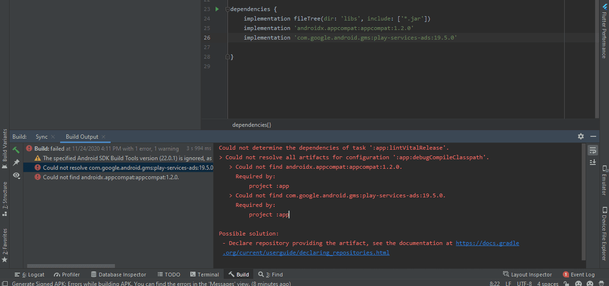 Could not find com.google.android.gms:play-services-ads:19.5.0. Required by: project :app