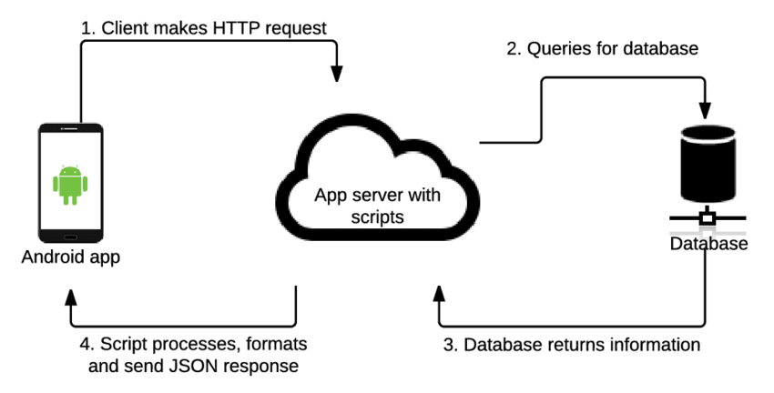 إليك صورة توضيحية لتفاعل التطبيق مع السيرفر وقواعد البيانات: