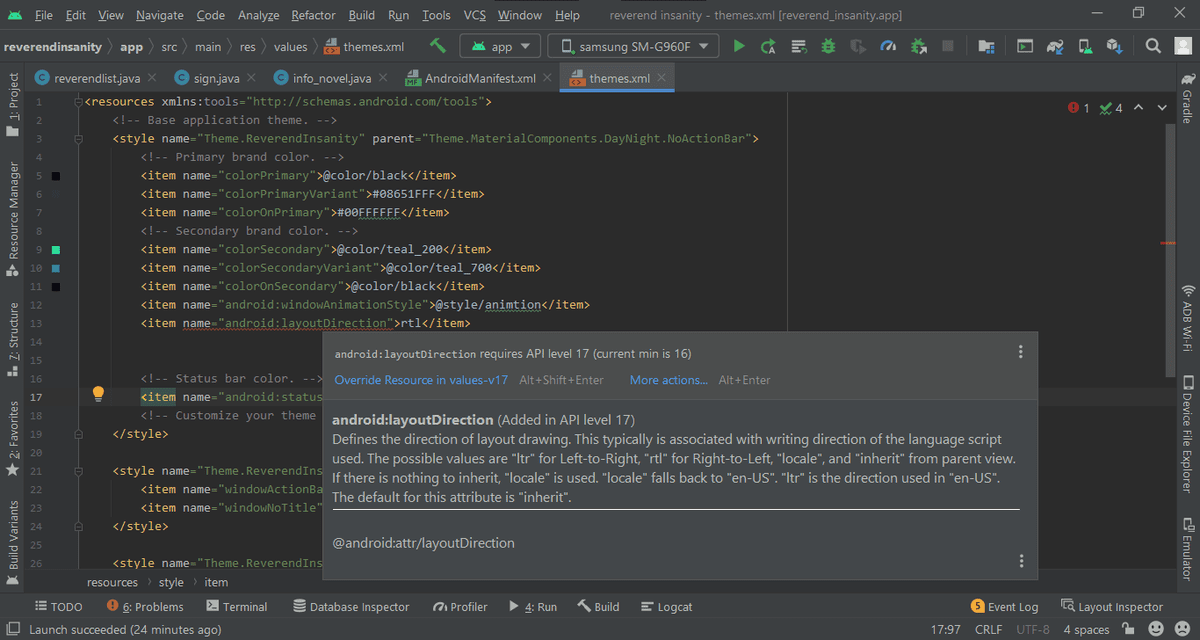 يمكننا إجبار التطبيق لعرض المحتوى باتجاه واحد، RTL يمين لليسار، ,أو LTR يسار لليمين.
