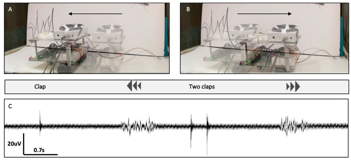 عند التسجيل العصبي تم استخدام مضخم تيار مصمم خصيصا للتجربة مناسب للمستقبلات العصبية، حيث يتم تصفية التيار وتضخيمه مرتين، ويتكون الروبوت المستخدم في من محول ADC، و UpBoard، و microcontroller يقوم بتطبيق كود برمجي يحرك الروبوت للأمام عند التصفيق مرة واحدة، وللخلف عند التصفيق مرتين. حُلِّلت البيانات العملية بعد إجراء 29 تجربة على طبلة الجرادة، للحصول على عدد كافي من التسجيلات لنمط استجابة العصب السمعي.