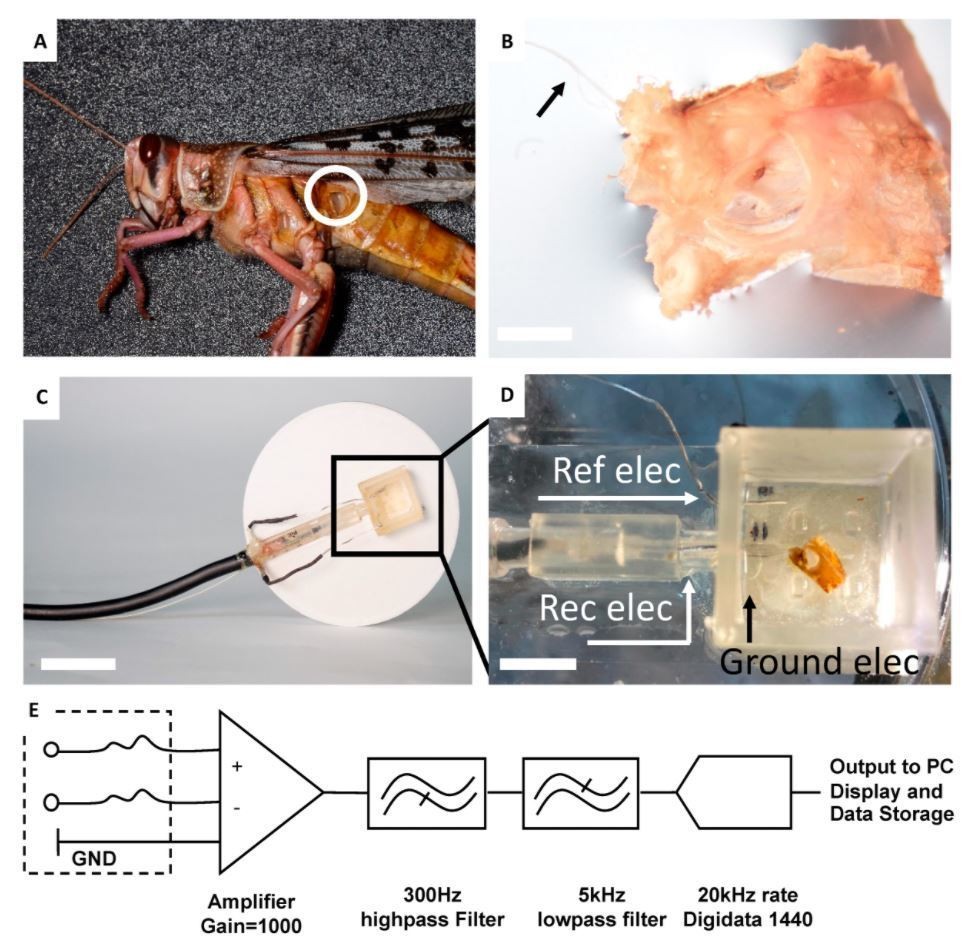 تمت عملية استخراج الأذن والأعصاب الخاصة بها على عدد من المراحل الدقيقة باستخدام جرادات صحراوية بالغة، حيث خُدِّر الجراد ثم قطع رأسه وساقيه، ثم استؤصل البطن و فُتح القفص الصدري، وصولاً إلى طبلة الأذن و العصب السمعي، ثم وضعه في شريحه خاصة مليئه بمحلول ملحي للحفاظ على الأعضاء حية، سُجِّل نشاط العصب السمعي باستخدام مكبر صوت، ووضع ميكروفون بالقرب من الشريحة لاستخدامه كأداة تحكم.