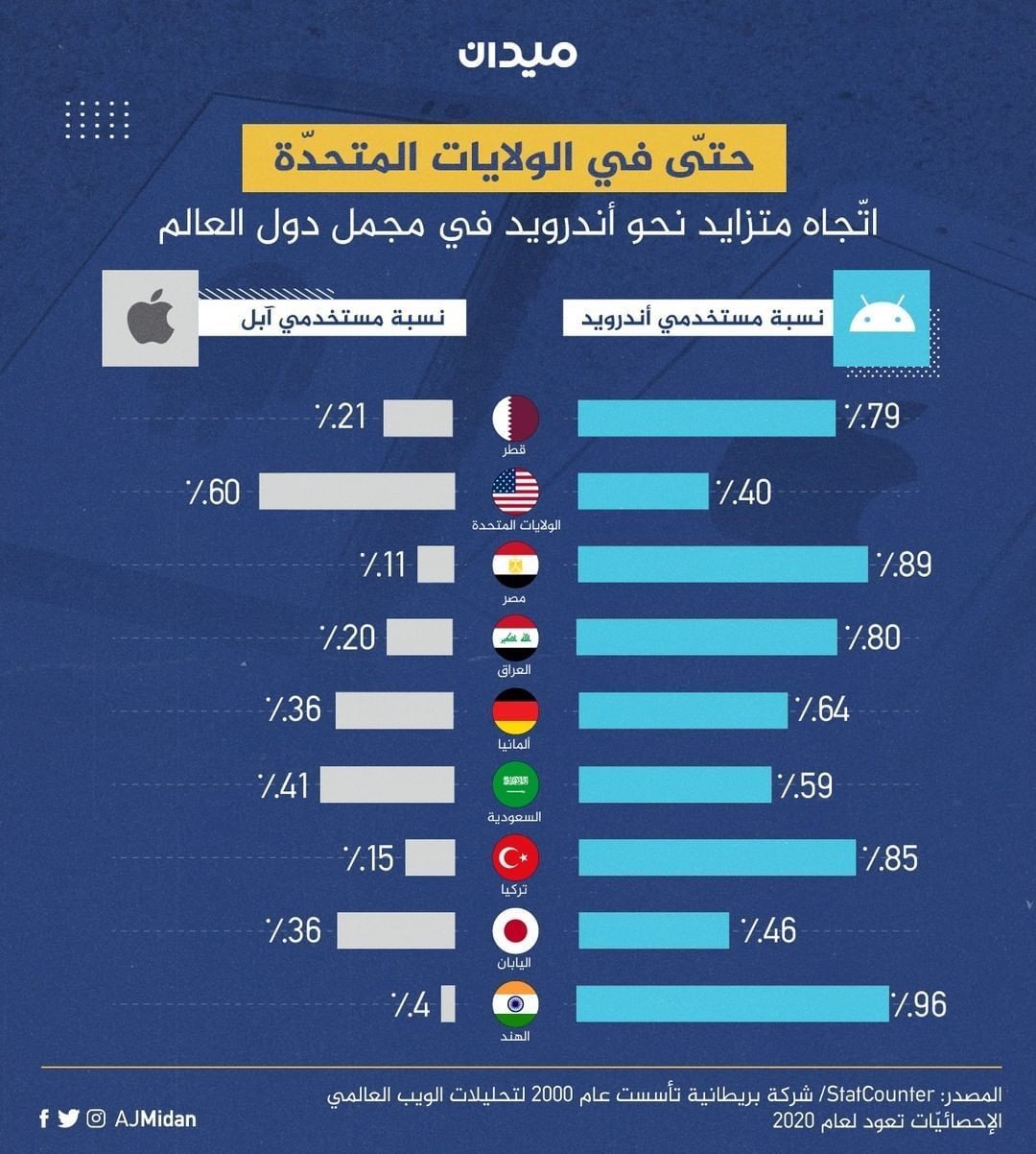 قد يعود الأمر في هذه النسبة بشكل رئيس بسبب توفر هواتف أندرويد بشكل أكبر واقتصادي أكثر من هواتف ايفون،