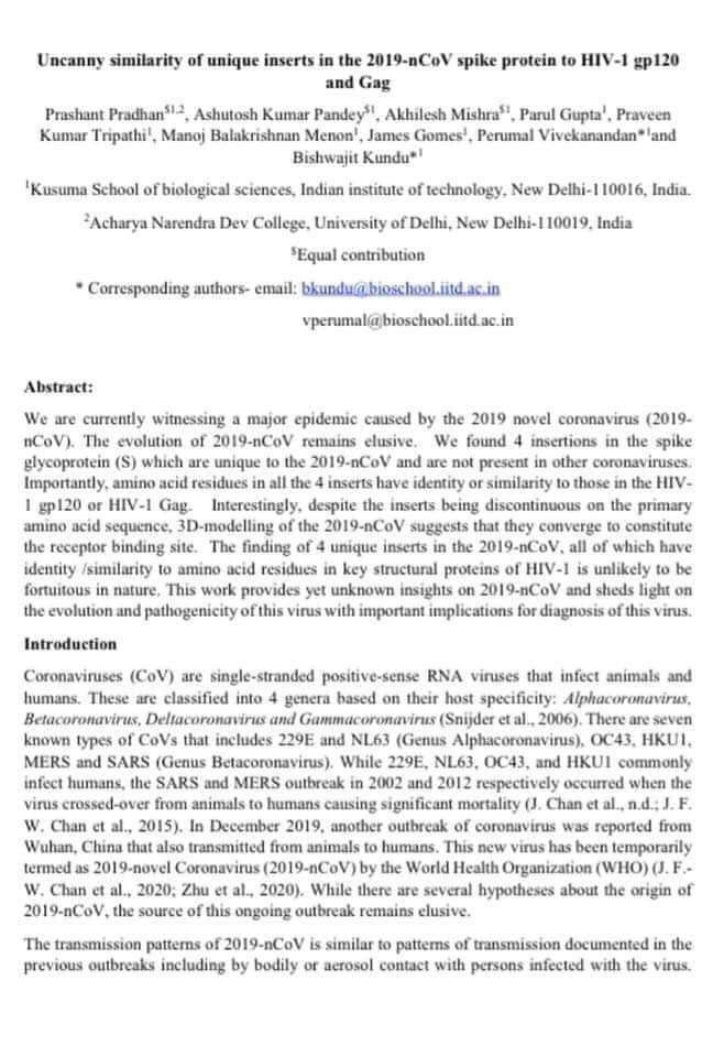 وقام فريق بحث هندي بعمل بحث خاص بفيروس كورونا، وتحليل الDNA الخاص به، وذلك عن أخذ أربع عينات من جليكوبروتين الخاص بفيروس كورونا الجديد وغير متواجد بالنسخ الأخرى من الفيروس، وأن بقايا الأحماض الأمينية في جميع الأجزاء الأربعة لها هوية أو تشابه مع تلك الموجودة في HIV-1 gp120 أو HIV-1 Gag ( مرض نقص المناعة).