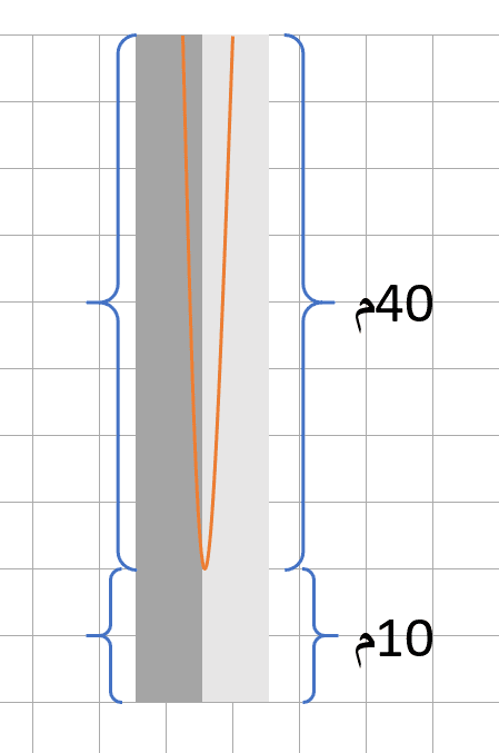 عندما تكون المسافة بين العمودين تساوي 80 متر. سيكون الكابل موازيا للارض ومرتفعا عنها ارتفاع قدره 50 متر.
