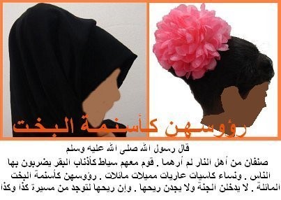 6- " صنفان من أهل النار لم أرهما بعد (أي لم تكن موجودة في حياته) : رجال معهم سياط كأذناب البقر يضربون بها الناس ، ونساء كاسيات عاريات مائلات مميلات على رؤوسهن كأسنمة البخت المائلة ، لا يدخلن الجنة ولا يجد ريحها ، وإن ريحها ليوجد من مسيرة كذا وكذا ".