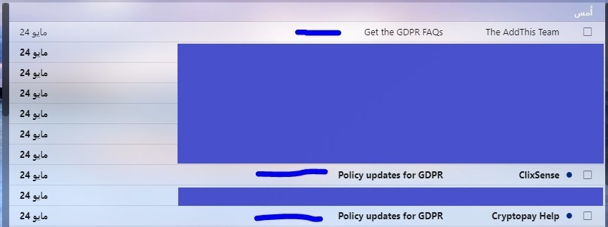 في خلال الأيام الثلاثة الماضية وحتى الآن امتلأ صندوقي البريدي برسائل جمة من كل المواقع المُشترك بها (جوجل - فيسبوك - تويتر - ويكيبيديا - Nature Research - Wirex - entropay ومواقع أخرى) حتى التي أزورها باستمرار دون أن أسجل فيها حسابًا تُعلم على صفحتها الرئيسية لتُعلمني بتحديث سياساتها وحدوث تغييراتٍ فيها