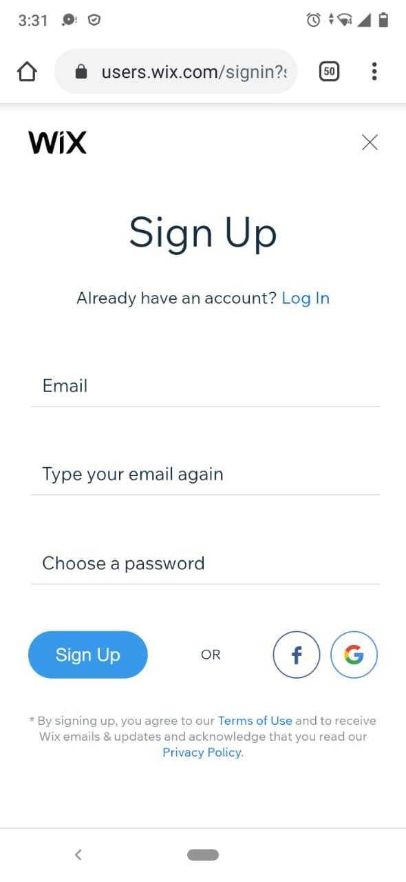 الضغط على Get Started والتسجيل إما من خلال حساب Gmail أو Facebook. يظهر لك من الجهة الأخرى 3 خانات، الخانة الأولى البريد الإلكتروني، والخانة الثانية اعادة كتابة البريد الإلكتروني مرة أخرى والخانة الأخيرة اختيار كلمة المرور الخاصة بحسابك عبر منصة WIX. بعد أن تقوم بملء الخانات، قم بالضغط على Sign Up