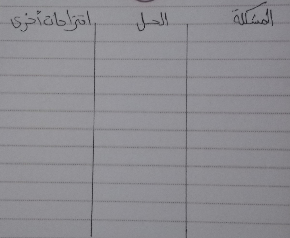 ثم توصلت لطريقتي الخاصة والتي استلهمتها من طريقة كورنيل وهي تقسيم الصفحة لثلاثة أقسام متوازيين الأولى المشكلة والثانية الحل والثالثة اقتراحات أخرى.، وكانت أكثر الطرق فاعلية معي حتى الآن.