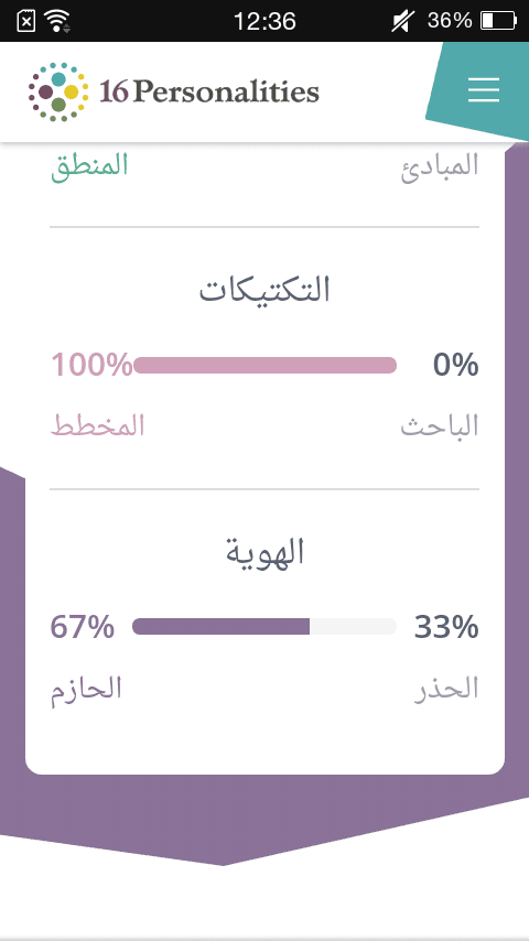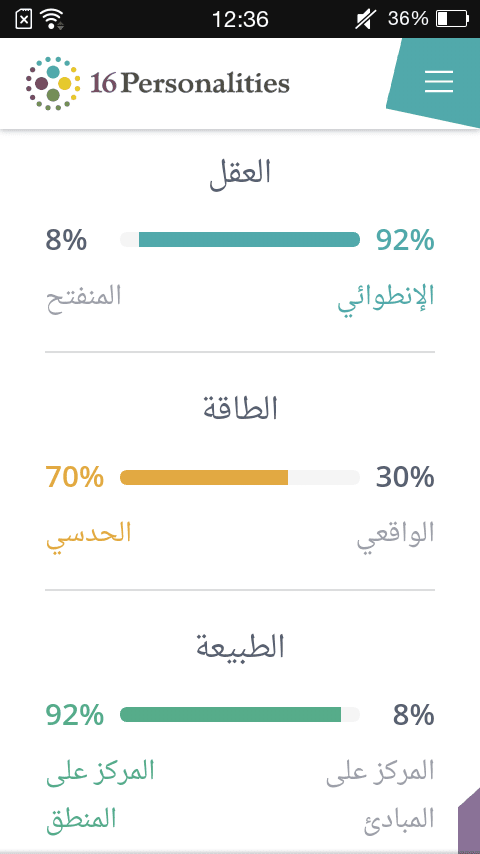 مرحبا انا اسمي مايا سلسبيل من الجزائر و عمري 13 سنة و نمط شخصيتي هو intj اي المهندس، انا انطوائية و مخططة و اتبع عقلي بدل قلبي ، حسنا انا لست منفتحة كثيرا لكني كنت اود ان اعرف نتائجكم و من يتطابق معي فل يخبرني عنه و اليكم نتائجي في الإختبار، احاول ان اكون اجتماعية 😓😬