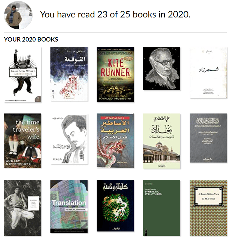 القراءة هي أول وأوضح وأهم الأهداف السنوية لي في كلّ عام، فهي هدف يسهلُ قياسه وتحديده ولها -باعتقادي- تأثير مباشر وجوهري على حياة الإنسان في كلّ مجال من المجالات. والحقيقة أني أشعر بحزن وشفقة على نفسي مما قضيتهُ من سنين أكافحُ فيها لقراءة كتاب أو كتابين وأحتفل بهما وكأني حققتُ إنجازاً عظيماً، على أن هذه -برأيي- طريقة سيّئة للنظر إلى القراءة وتنمّ عن كارثة متجذّرة في تنشئتنا وثقافتنا، التي تنظرُ إلى القراءة وكأنها عملٌ شاقّ لا على أنها جزءٌ من روتين الحياة، وهو ما أسعى لهُ فعلياً من أهدافي في القراءة. كنتُ في السنين الماضية أضعُ لنفسي هدفاً متواضعاً لا يتجاوزُ كتابأً في الشهر، على أني تجرَّأتُ فيه ذا العام على رفعه إلى 25 كتاباً (وهي جرأةٌ لم أفي بها، لكني اقتربت).