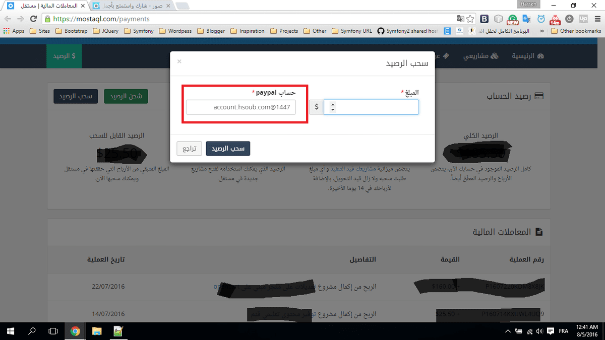 اليوم اردت ان اقوم بسحب ارباحي على مستقل واذا بي عندما دخلت الى "سحب الرصيد" لاحظت ان خانة حساب بايبال معبئة منذ البداية بايميل حسابي الموحد (على ماأعتقد) كما توضح الصورة التالية :