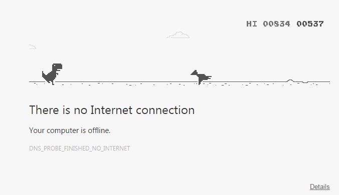 انقطع الإنترنت وإذا بالديناصور الصغير يُلمح لك في انتظار الإنطلاق في جولة جديدة معه وتبدأ في الضغط على ذر المسافة الفارغة ويبدأ هو في الإنطلاق وشيئاً فشيئاً تتقدم واصوات تخطي المائات تتعالى وتظهر لك الصقور وتقفز فوق هذا وتنحني تحت هذا وتنسجم وتحبس أنفاس لاقترابك تحطيم رقمك القياسي السابق وفجأه يعود إليك اتصال الإنترنت مجدداً، وحينها تلعن عودة الاتصال :)