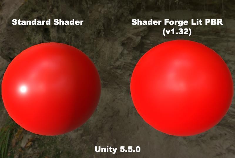 فعلى سبيل المثال لاحظ الصورة أدناه، الـ Texture مماثل لكلا الكرتين (اللون الأحمر) ولكن بتطبيق Shader مختلف عليهما فإنّ الضوء ينعكس عنهما بطريقة مختلفة ليبدو وكأنّ الكرتين مختلفتين (هما في نهاية المطاف مختلفتين باختلاف الـ Shader وبالتالي الـ Material الخاصة بهما، بما أنّا قلنا أنّ الـ Material تحتوي بداخلها على الـ Texture و الـ Shader)