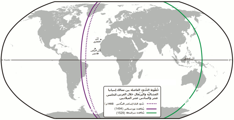 استعمرت الدولتان عدة مناطق في افريقيا خاصة جزر المحيط الاطلسي و في العام الذي سقطت فيه غرناطة 1492 وصل كولومبوس الى امريكا و لكي لا يحدث صدام بين الدولتين قام البابا سنة 1493 بتقسيم العالم بين الدولتين بواسطة خط وهمي يقع غرب جزر الرأس الاخضر قبالة السنيغال , و تم تعديل الخط في معاهدة تورديسيلاس 1494 ليقع في مكان وسط بين هيسبانيولا (هاييتي) الاسبانية و جزر الرأس الاخضر البرتغالية