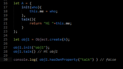 ثم في السطر 25 اعتمدنا على ربط obj1 ب A ف الآن obj1 لا يحتوي على الدالة talk لكن في السطر 28 عند استدعائها بحثت الجافاسكربت على الدالة داخل obj1 و لم تجده و بما أننا ربطنا obj1 ب A بواسطة Object.create ستتوجه الجافاسكربت الى A لترى ان كان هناك دالة talk أو لا، فوجدتها و تم استدعائها و هنا قامت الجافاسكربت ب "السلوك التوجهي" فهي توجهت من obj1 الى A لتجد الدالة وهكذا . . .