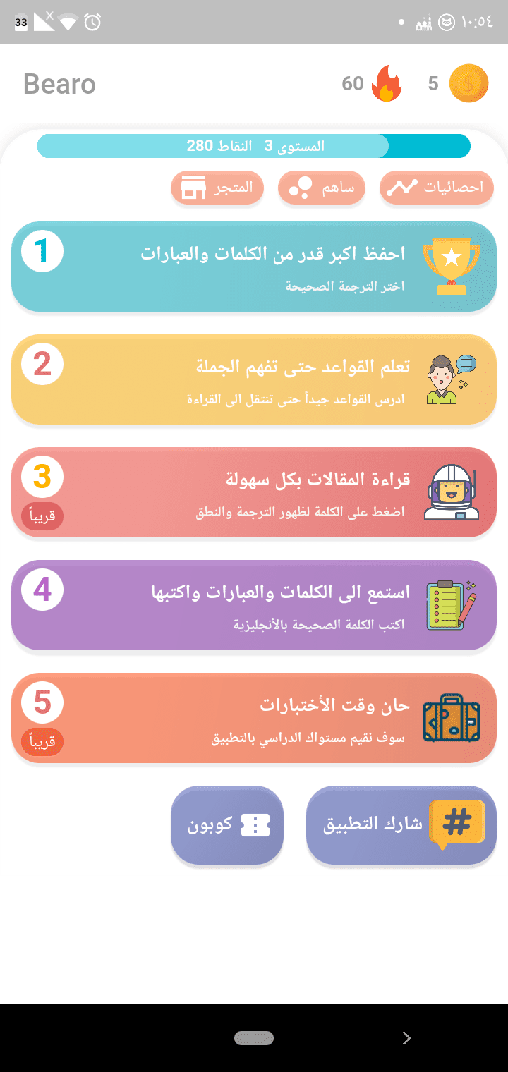 برمجت تطبيق لتعلم اللغة الانجليزية Bearo English لحفظ الكلمات بشكل عشوائي وفي كل مستوى 20 كلمة حتى يسهل حفظها ونطق صوتي وبدون انترنت