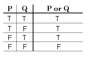كما تلاحظون فالقضية p أو q تكون خاطئة فقط عندما تكون كلا القضيتين خاطئة و تكون صحيحة في كل الحالات الأخرى.