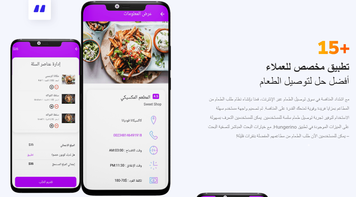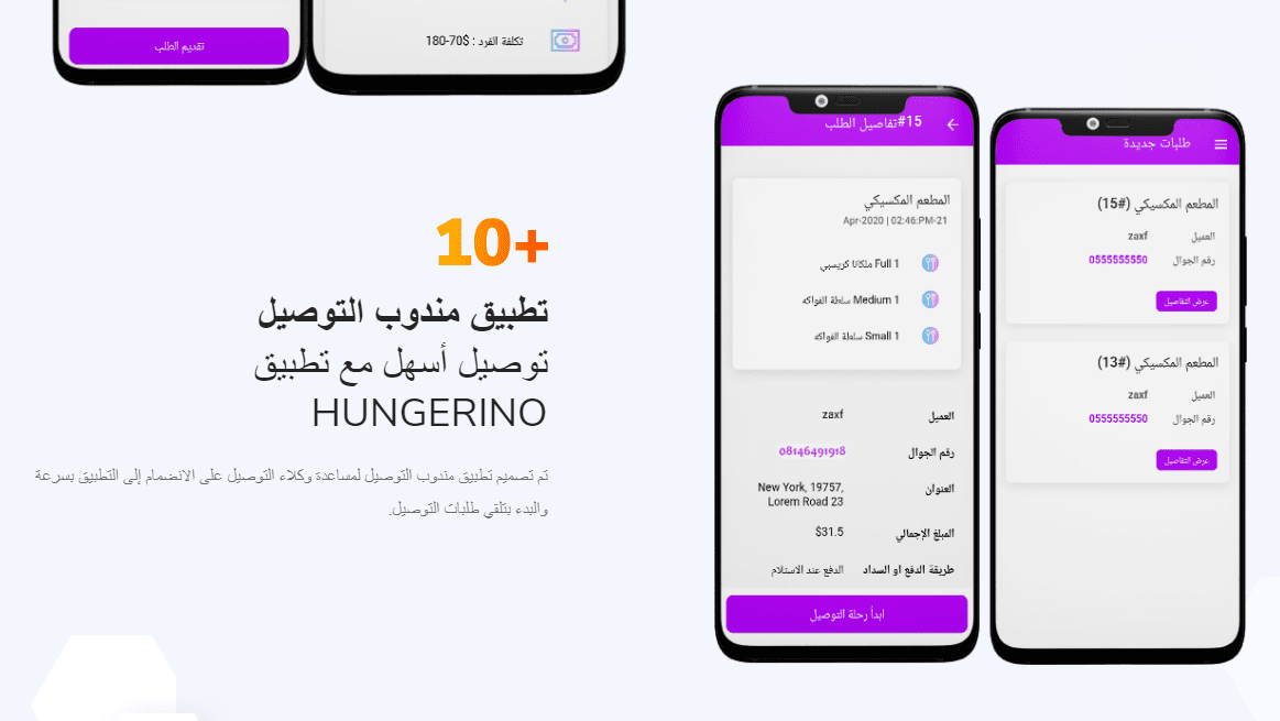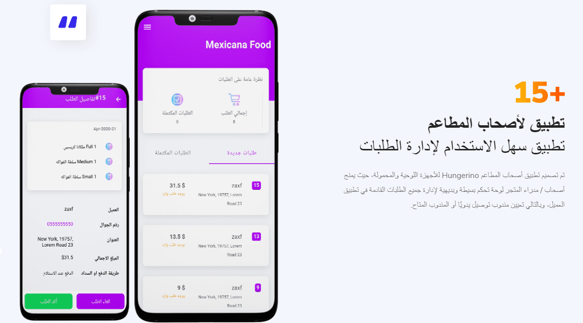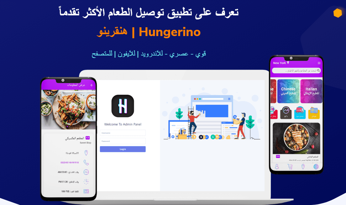تطبيق Hungerino توصيل طلبات المطاعم، مثل هنقرستيشن مع لوحة تحكم وتطبيق للعميل + تطبيق للمطاعم + تطبيق للمندوب