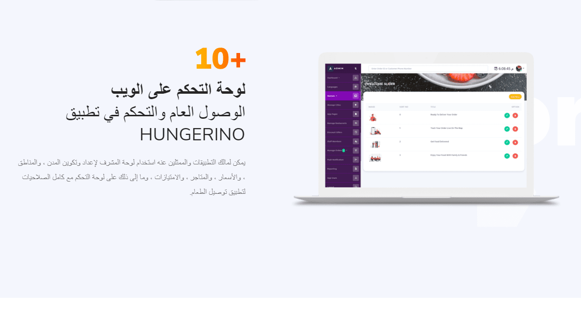 يمكن لمالك التطبيقات والممثلين عنه استخدام لوحة المشرف لإعداد وتكوين المدن ، والمناطق ، والأسعار ، والمتاجر ، والامتيازات ، وما إلى ذلك على لوحة التحكم مع كامل الصلاحيات لتطبيق توصيل الطعام.