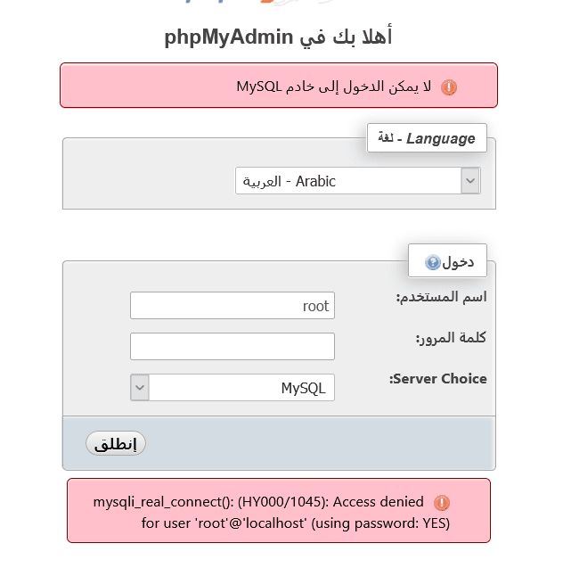 السلام عليكم عند الدخول يطلب اسم مستخدم وباسورد في الخادم المحلي mysql