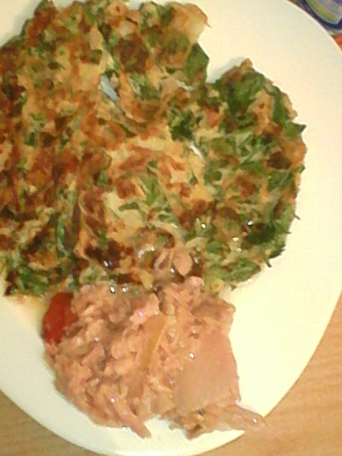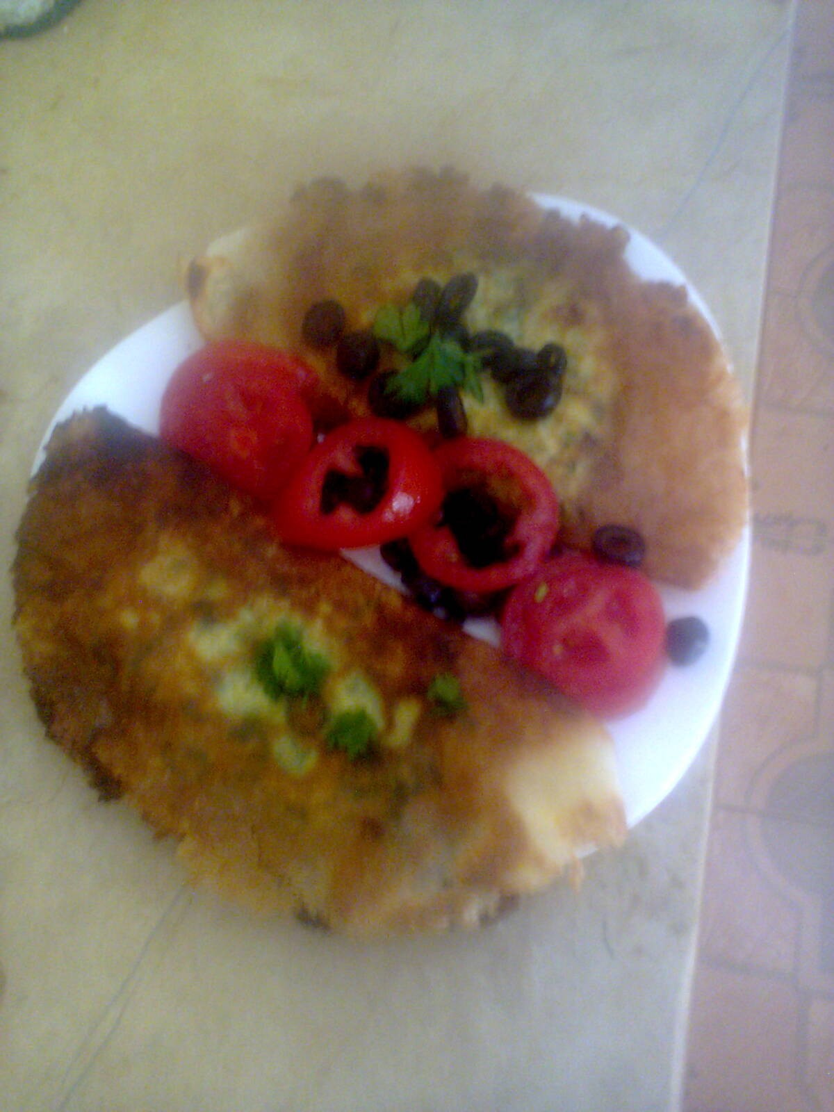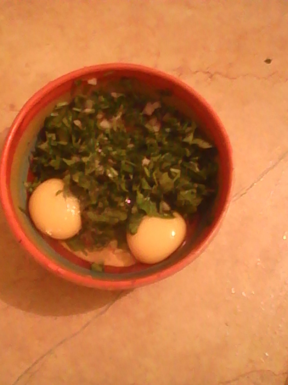 المستلزمات: بيضتين، نصف بصلة، بقدونس (إسمه معدنوس عندنا) ، رشة ملح،( جبن مبشور، تونة: إختيارية). تقوم بخلط المستلزمات.