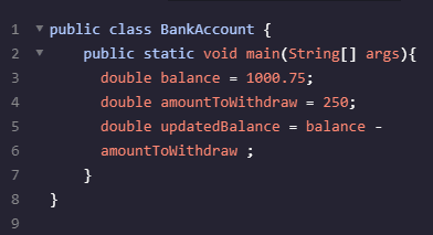 double updateBalace = balance - amountToWithdraw // Double