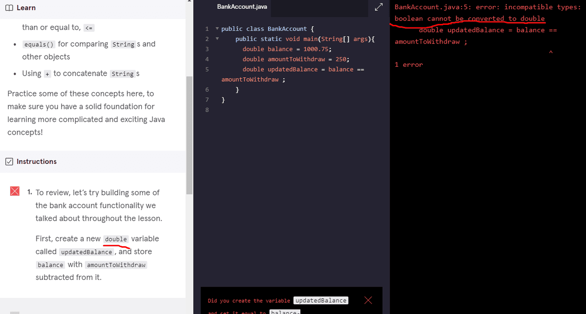 لاحظ أنه في السطر الخامس الجملة balance == amountToWithdraw تقوم بمقارنة قمية ال balance مع قيمة amountToWithdraw فإذا كانت القيم متساوية تقوم بإرجاع true و إن لم تكن متساوية تقوم بإرجاع false أي قيم من النوع boolean و هو غير مناسب لنوع المتغير updatedBalance حيث أنه من النوع double.