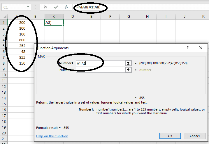 ثم سوف يظهر لك مربع لإدخال القيم التي ترغب بمعرفة القيمة الكبرى أو الصغرى لها، يمكنك إدخال القيم من خلال سحب مؤشر الفأرة على جميع الخلايا التي تحتوي على القيم. كما في الصورة في الأسفل.