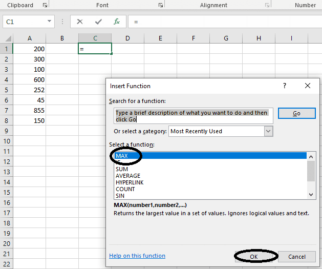 ثم يمكنك بعد إشارة = كتابة كلمة MAX أو MIN أو اختيار الدالة من fx كما في الصورة في الأسفل.