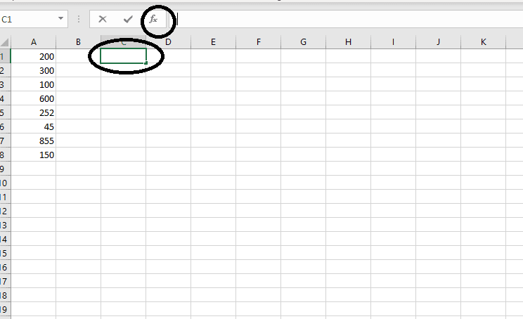 في البداية عليك كتابة القيام في جدول أكسل، من ثم تحديد الخلية التي تود إظهار الناتج فيها. ومن ثم كتبة = داخل الخلية أو الضغط على زر fx في قائمة الإدخال كما في الصورة.