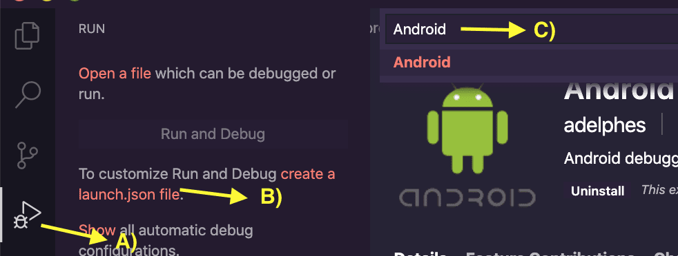 3.ثم انتقل إلى تبويبة "Run" ، واضغط على "إنشاء ملف launch.json" ، واكتب "Android" في الحقل الذي سيتم التأشير عليه أوتوماتيكياً وإختر "Android" من بين العناصر الظاهر وبعدها سوف يقوم تلقائيًا بتعبئة كل ما هو مطلوب.