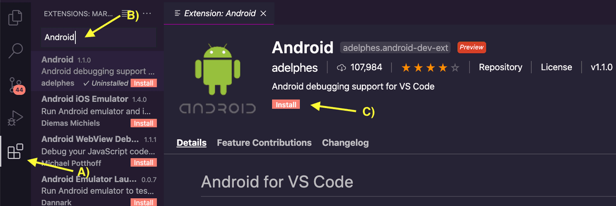 1.البرنامج أول ما نقوم بتنصيبه يكون بالإنجليزية لهذا تتجه لتبويبة Extensions ونبحث عن "Android" ونبحث عن الإضافة المُنشئة من طرف "adelphes" كونها الأكثر ثباتاً