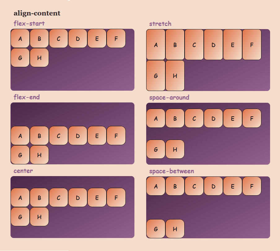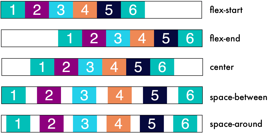 justify-content: flex-start; justify-content: center; justify-content: space-between; justify-content: space-around; justify-content: space-evenly;
