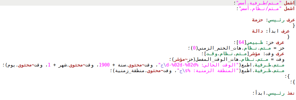 أطلقنا الإصدار 0.3 من لغة الأسُس البرمجية. اللغة الآن مقتصرة الآن على البرمجة الإجرائية (procedural programming)، أي مشابهة للغة سي (وليس سي++) كما أنها تفتقر لمكتبات واجهة المستخدم، لكن على الأقل يمكن الآن استخدامها لكتابة برامج حقيقية. المثال التالي لكتابة برنامج يطبع التاريخ الحالي:
