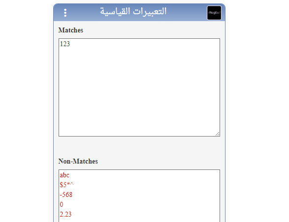 يوفر هذا التطبيق حلا عمليا لمشكلة البحث عن التعبيرات القياسية عن طريق كتابة النتائج الذي تريد أن يقبله التعبير وكتابة النتائج المستبعدة