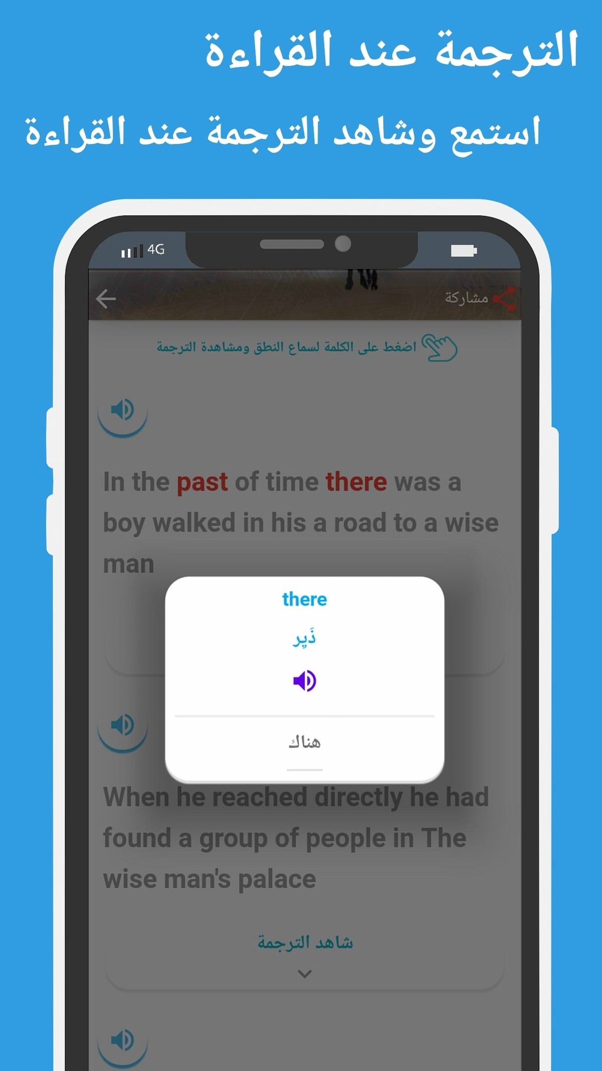 وعند قراءة القصص تم تقسيم كل جملة على حده ويوجد ترجمة لكل جملة وايضا ترجمه لكل كلمه في حال الضغط على اي كلمه في حال القراءة والتي ستظهر باللون الاحمر لمراجعتها بعد القراءة