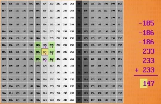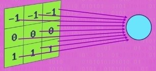 يمكننا ان نرى بسهولة من اين تبدا الحافة اليسرى للعمود لان هناك تغيرا واضحا بلون كل بكسل عمودي يمكننا تحديد هذا السلوك بشكل اكثر رسمية من خلال انشاء قاعدة توضيح الاحتمالية لكون البكسل حافة عمودية هو مقدار الاختلاف في اللون بين بعض وحدات البكسل الموجودة على يمينه والبكسلات المجودة على يساره كلما زاد اختلاف اللون بين هذه المجموعتين من البكسل زاد احتمال وجود البكسل على الحافة اذا كان الاختلاف صغيرا فمن المحتمل الا يكون حافة على الاطلاق يبدو الترميز الرياضي لهذه العملية كما يلي ويطلق عليه نواة او مرشح يحتوي على قيم المضاعفة بالبكسل والتي يتم حفظ مجموعتها في البكسل المركزي دعونا نرى كيف يعمل هذا مع مثالنا لقد قمت في هذه الصورة بتسمية جميع وحدات البكسل بقيم التدرج الرمادي الخاصة بها