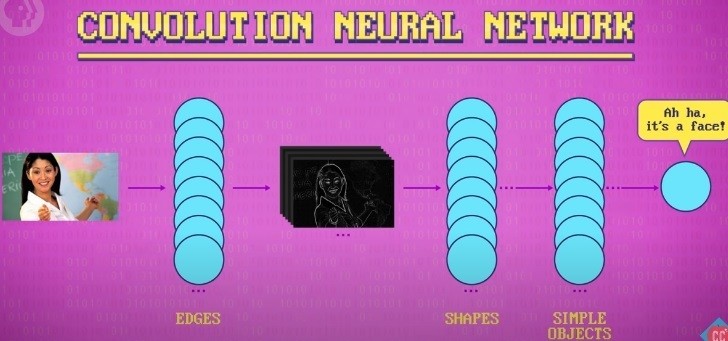 قد تلتف الطبقة بعد ذلك على ميزات الزوايا هذه وتحوي على خلايا عصبية يمكن التعرف على الأشياء البسيطة مثل الافواه والحواجب ويستمر هذا ويتراكم في التعقيد حتى توجد طبقة ثالثة تقوم بعمل الالتفاف التي تجمعها معا عيون اذن انف فم فيتم التعرف انه وجه