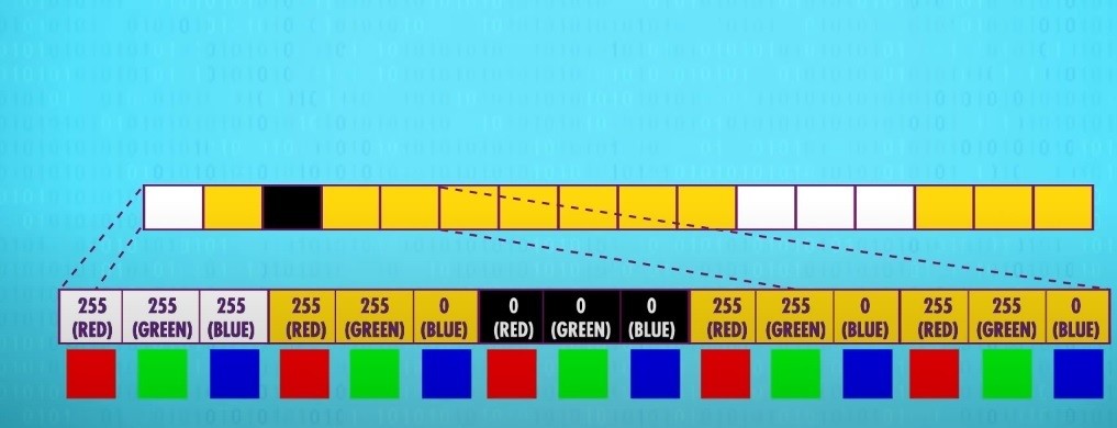 غالبا ما يتم تخزين الصور الموجودة على أجهزة الكمبيوتر كشبكات كبيرة من وحدات البيكسل يتم تخزين كل بيكسل بواسطة لون يتم تخزينه كمزيج من ثلاث ألوان أساسية مضافة هي الأحمر والاخضر والأزرق R G Bومن خلال الجمع بين الكثافة المختلفة لهذه الألوان الثلاثة ينتج ما يسمى القيمة (قيمة البكسل) إذا يمكننا تمثيل أي لون ... انظر الصورة التالية: