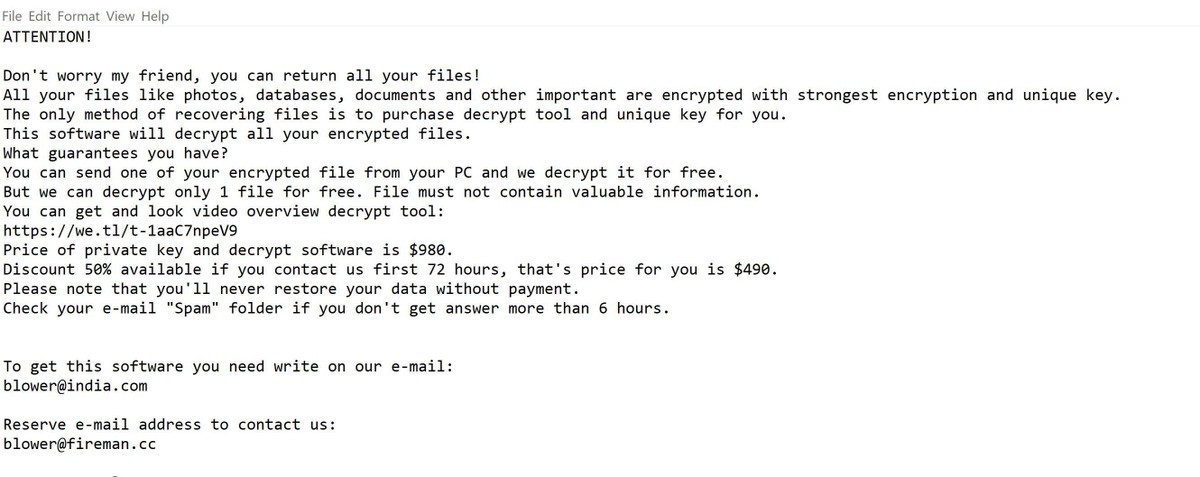 الفيرس من نوعية Ransomware ويقوم بتشفير جميع الملفات الموجودة بالقرص الصلب ولن تستطيع فتحها إلا بعد دفع فدية 980 $ ولكرم الهاكرز يمكنك دفع نصف المبلغ فقط بحالة تواصلت معهم ودفعت خلال ثلاثة أيام !