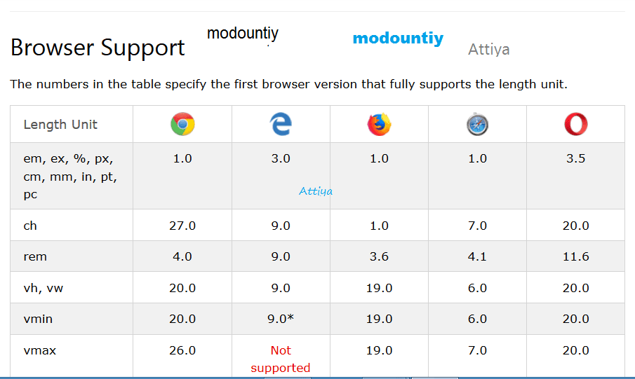 صوره توضح المتصفحات التى تدعم هذه الوحدات و المقاييس